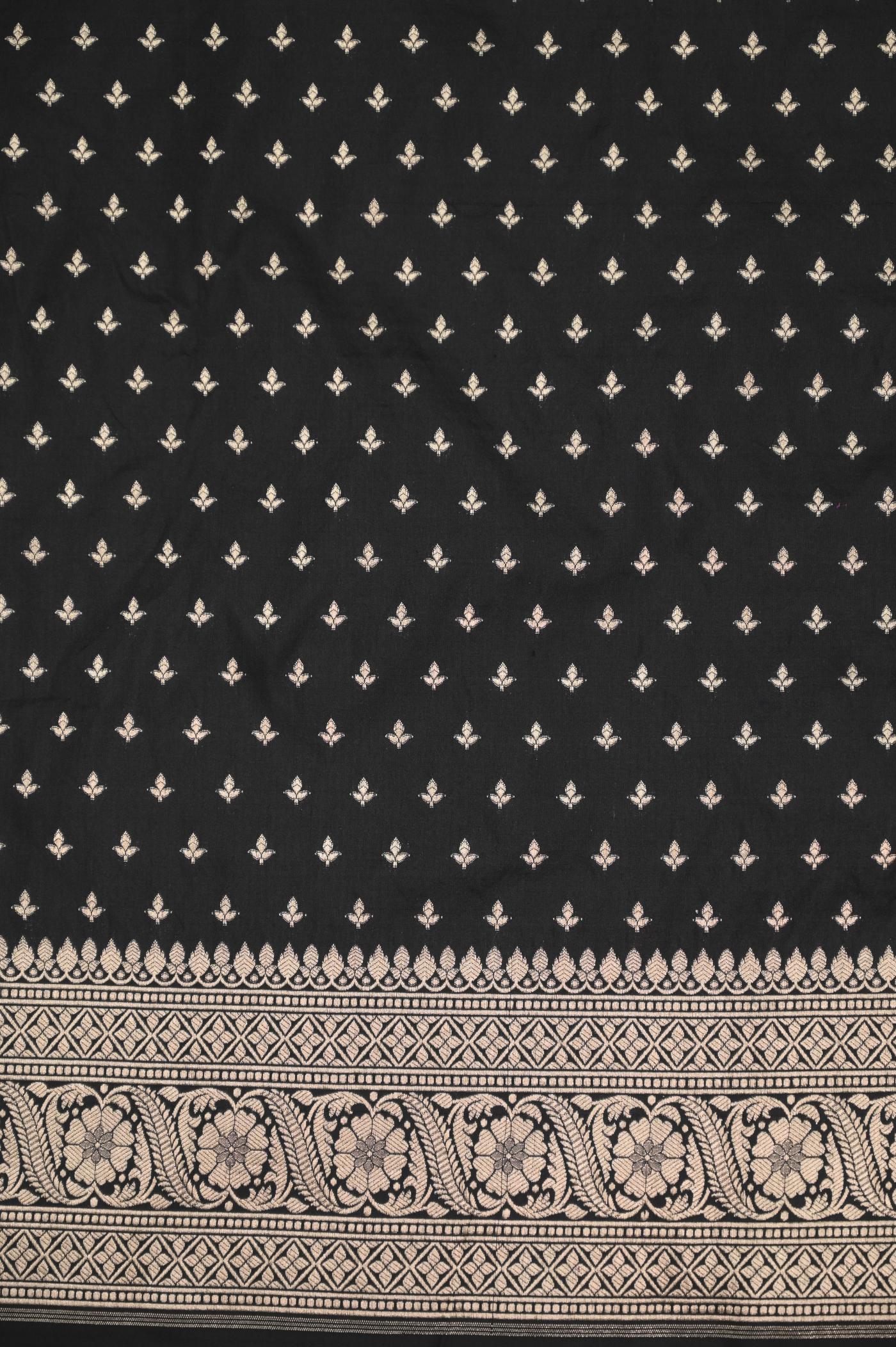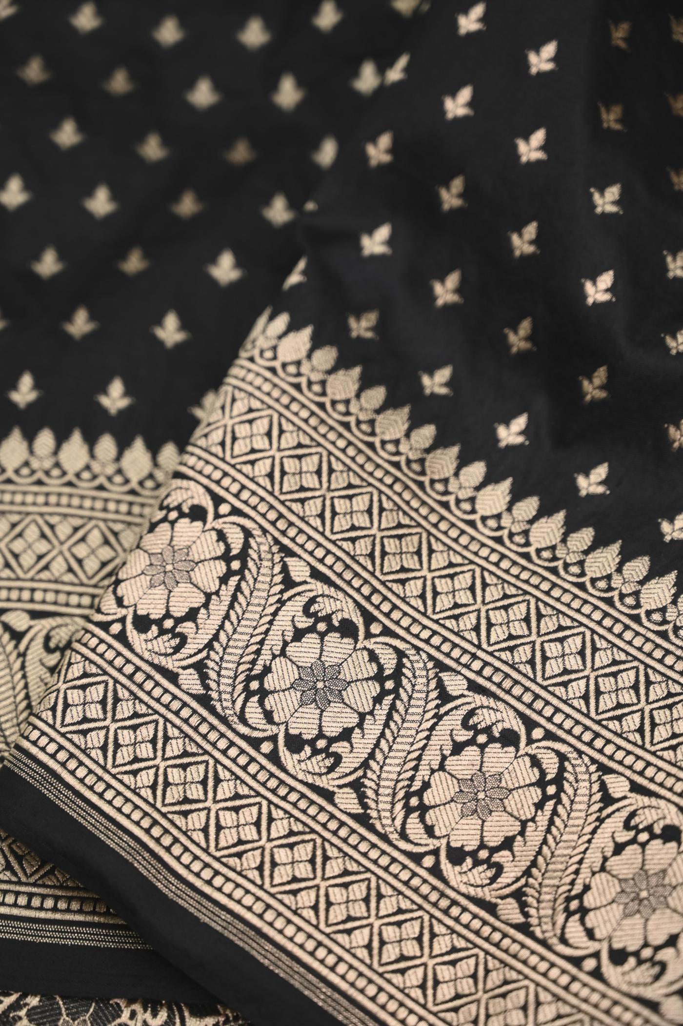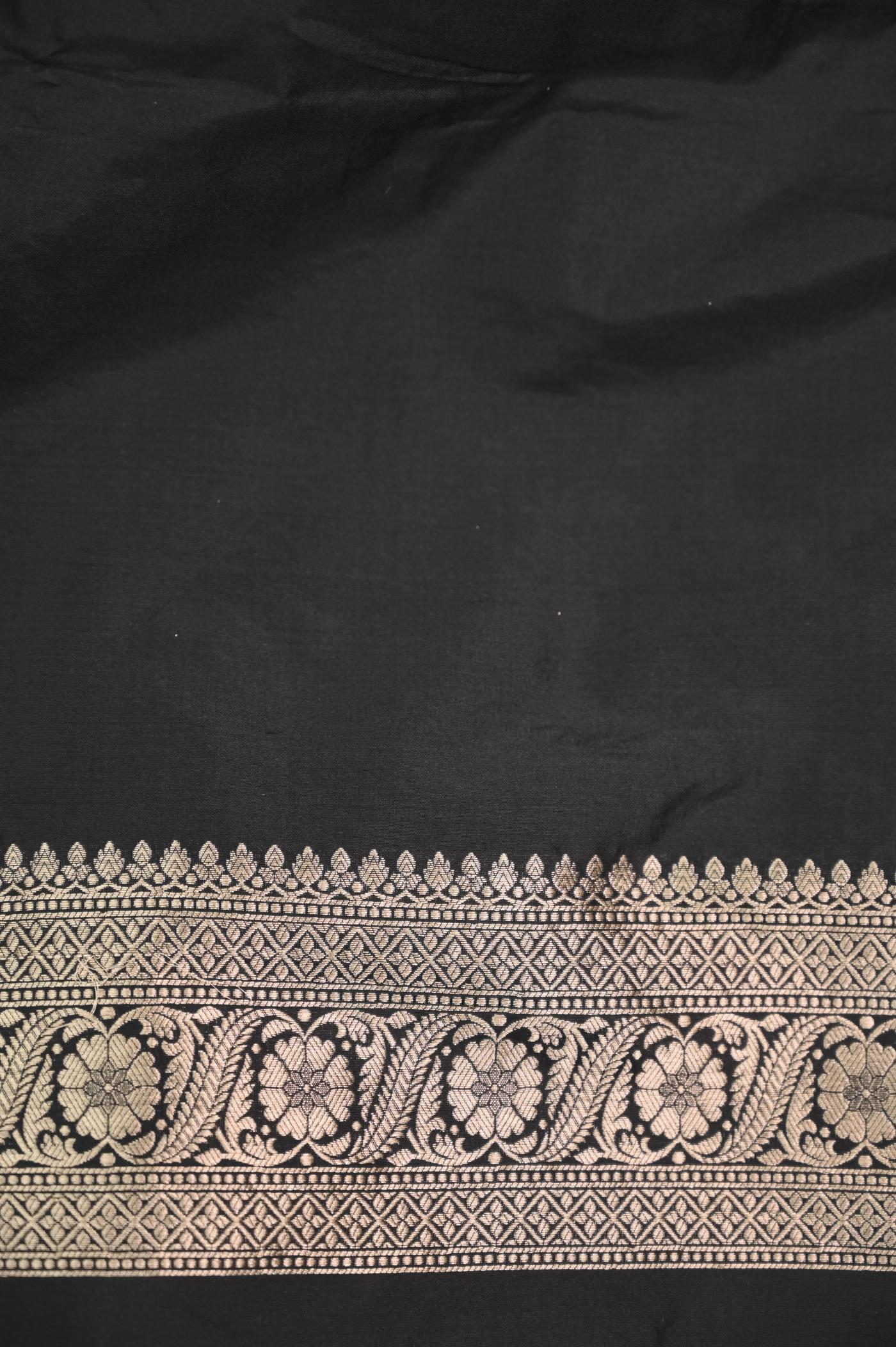 This Black Katan Opada Banarasi Saree is woven with the finest Banarasi Katan Silk as Fabric, sourced from the heartland of Banaras, known for its rich textile heritage.