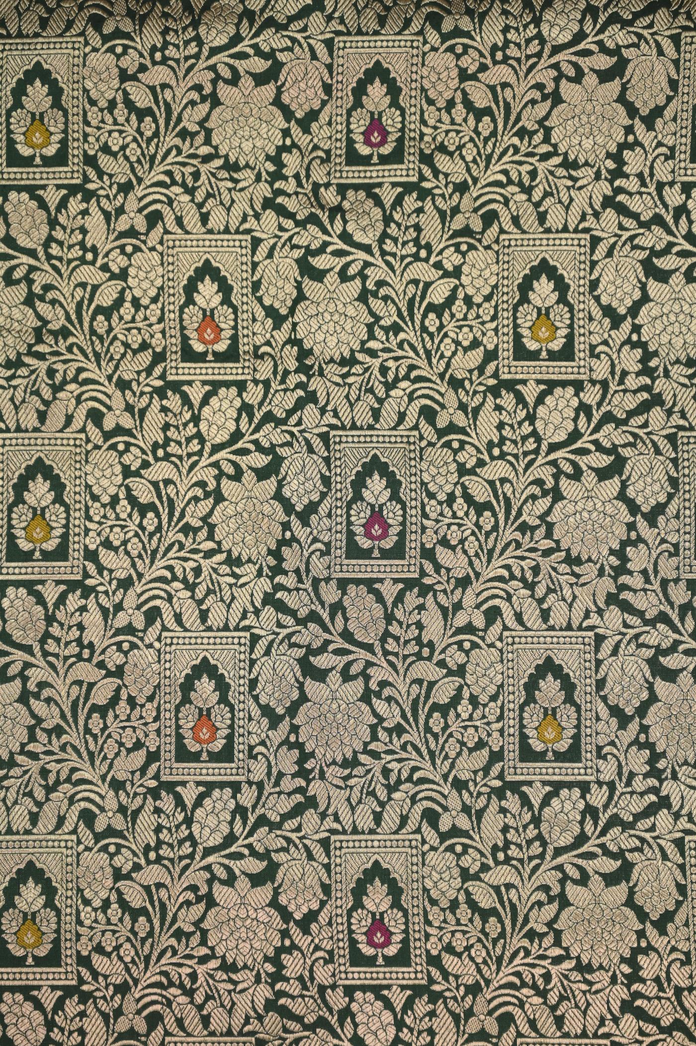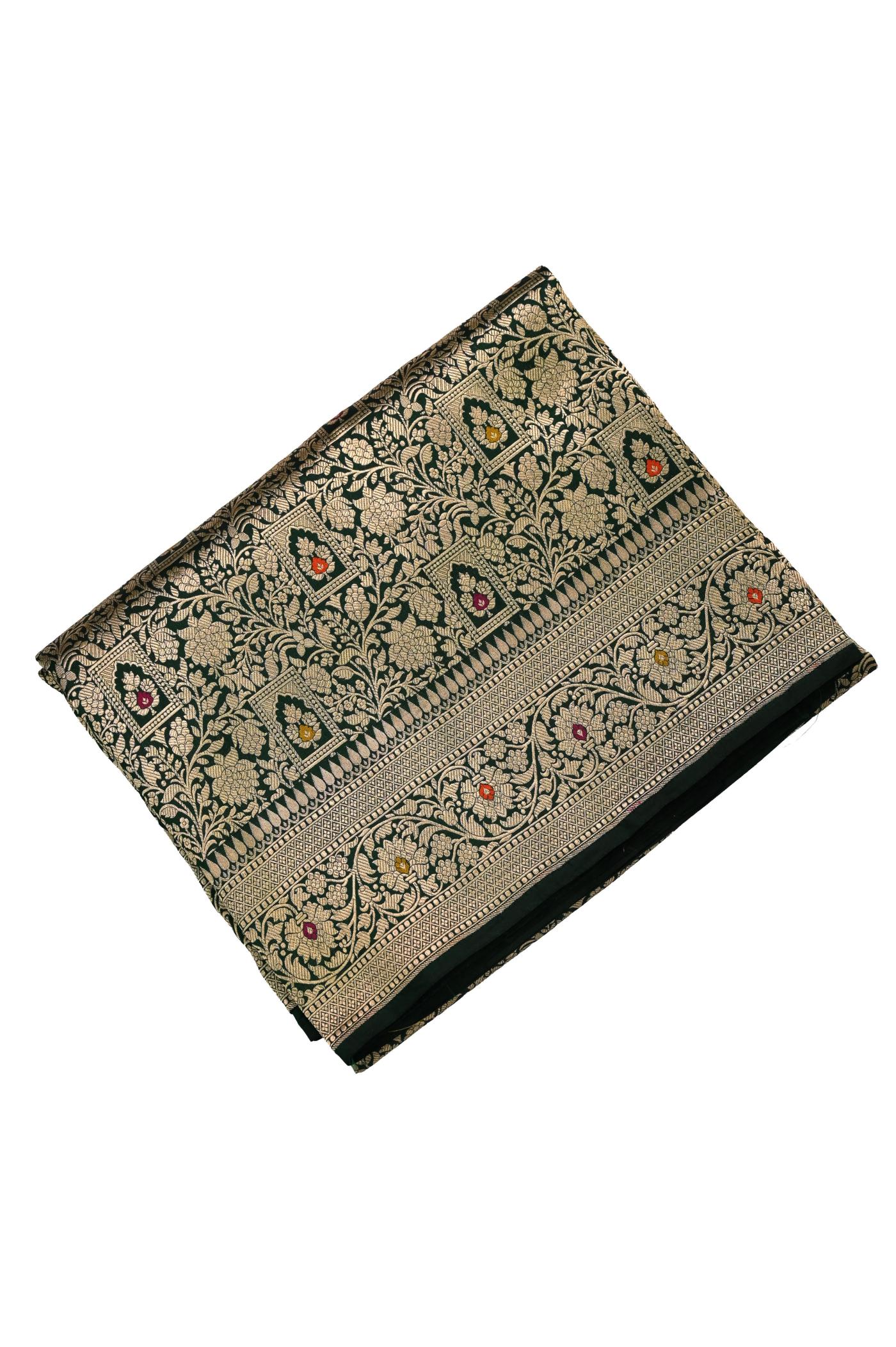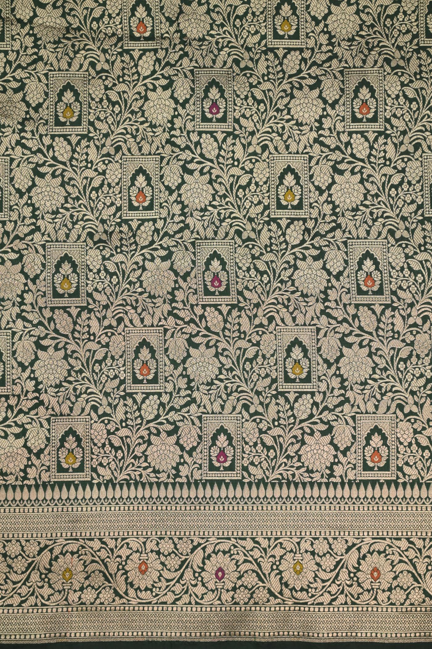 This Bottle Green Katan Alfi Opada Banarasi Saree is woven with the finest Banarasi Katan Silk as Fabric, sourced from the heartland of Banaras, known for its rich textile heritage.