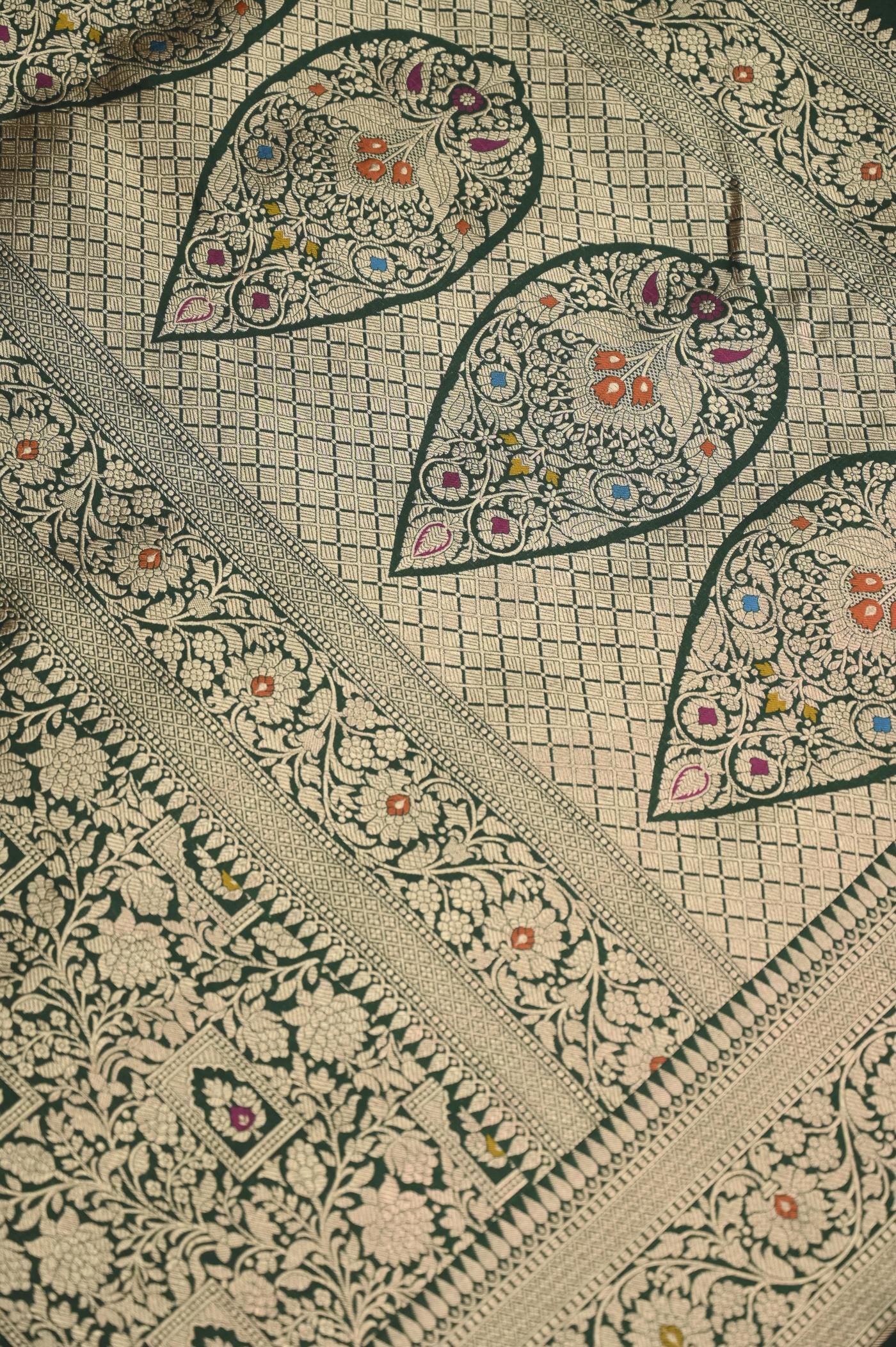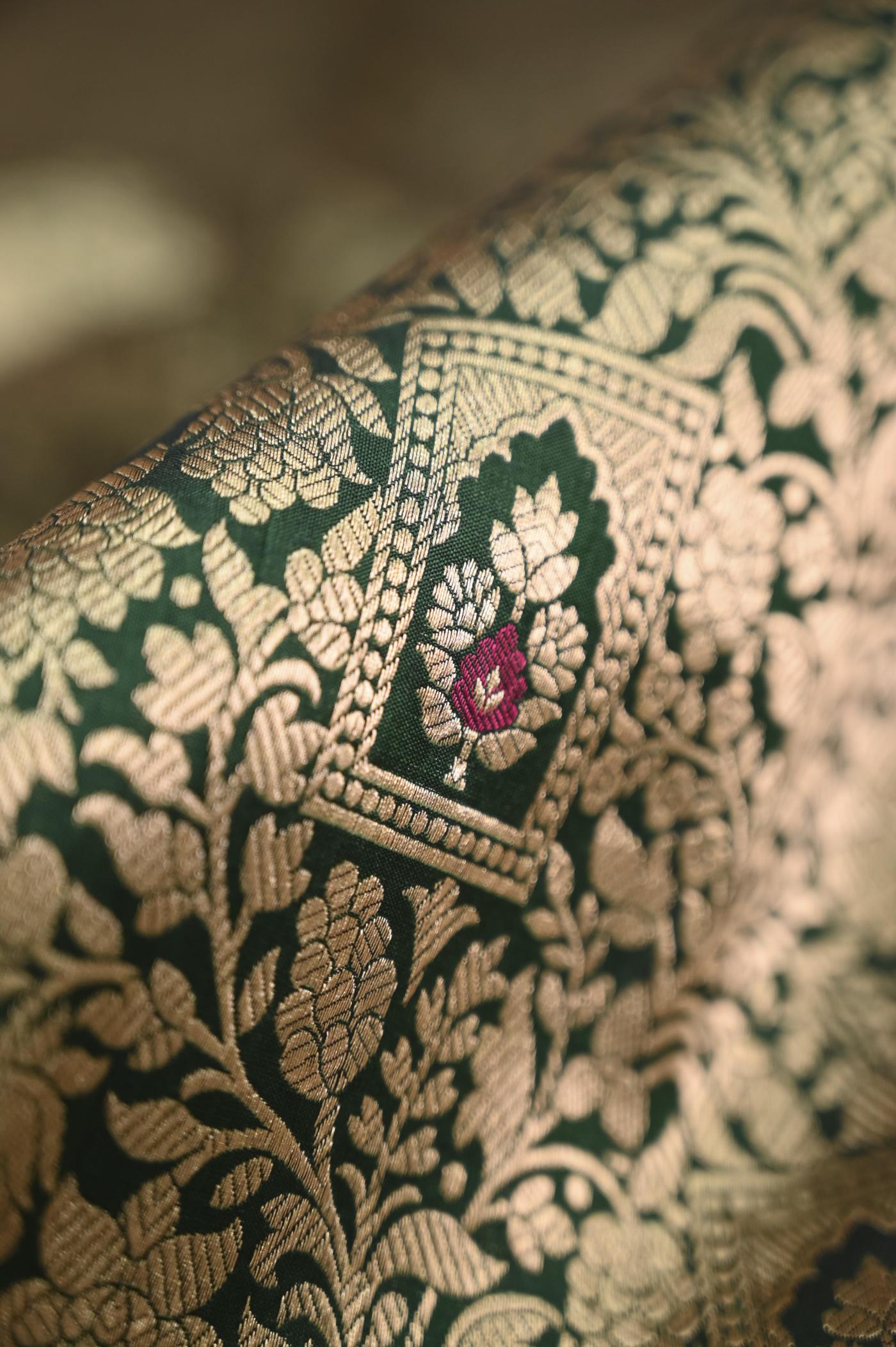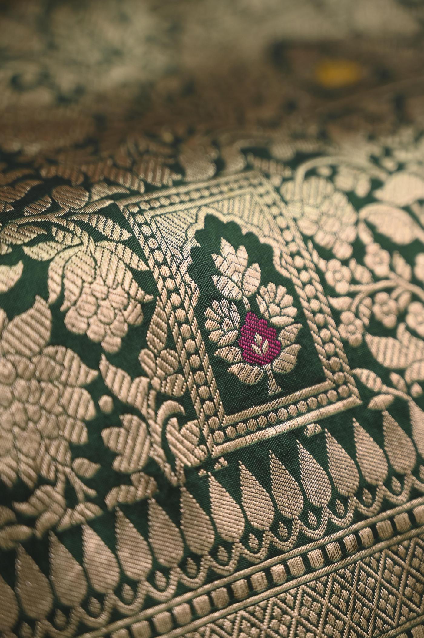 This Bottle Green Katan Alfi Opada Banarasi Saree is a timeless piece of art, embodying centuries of tradition and skill. It is a testament to the weavers' dedication and passion, with every intricate detail reflecting their mastery.