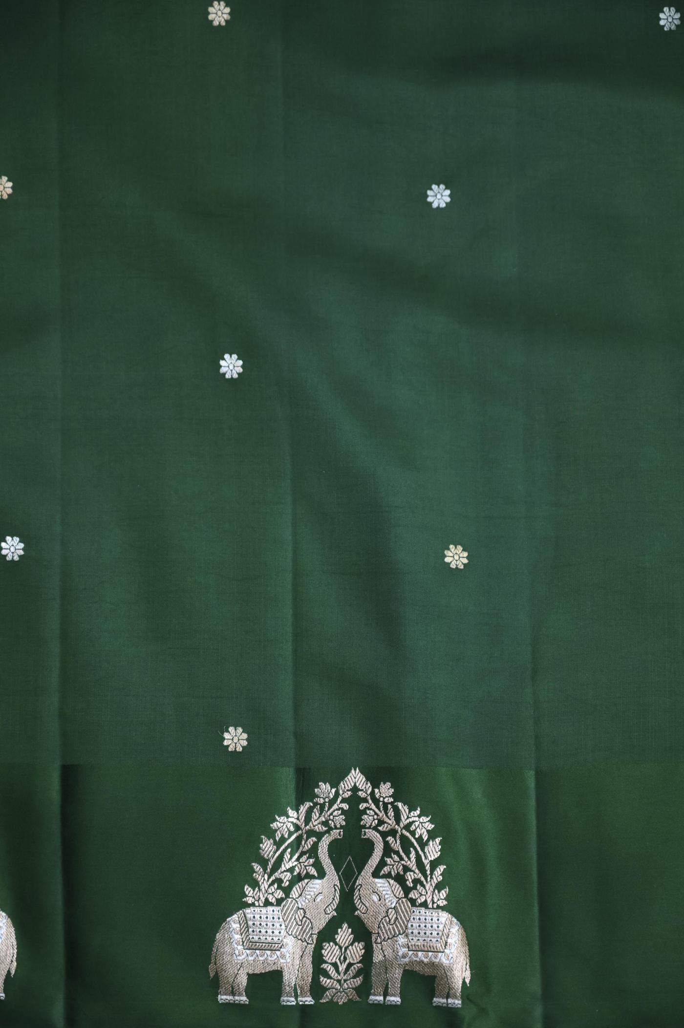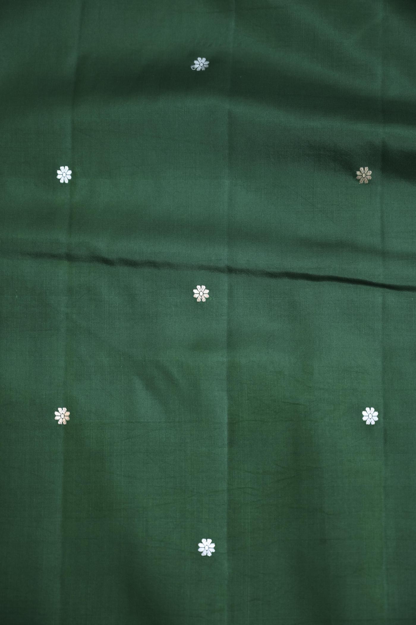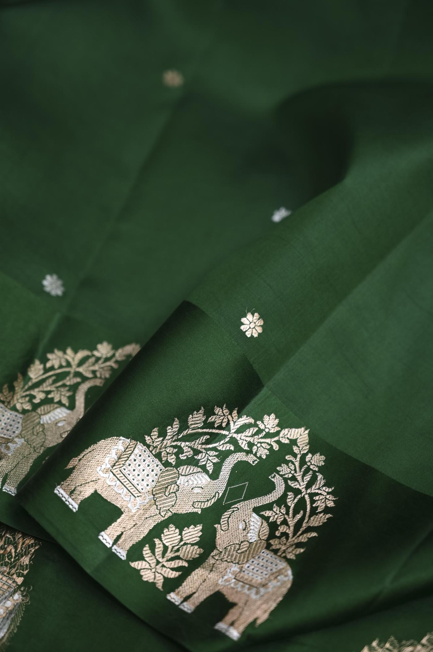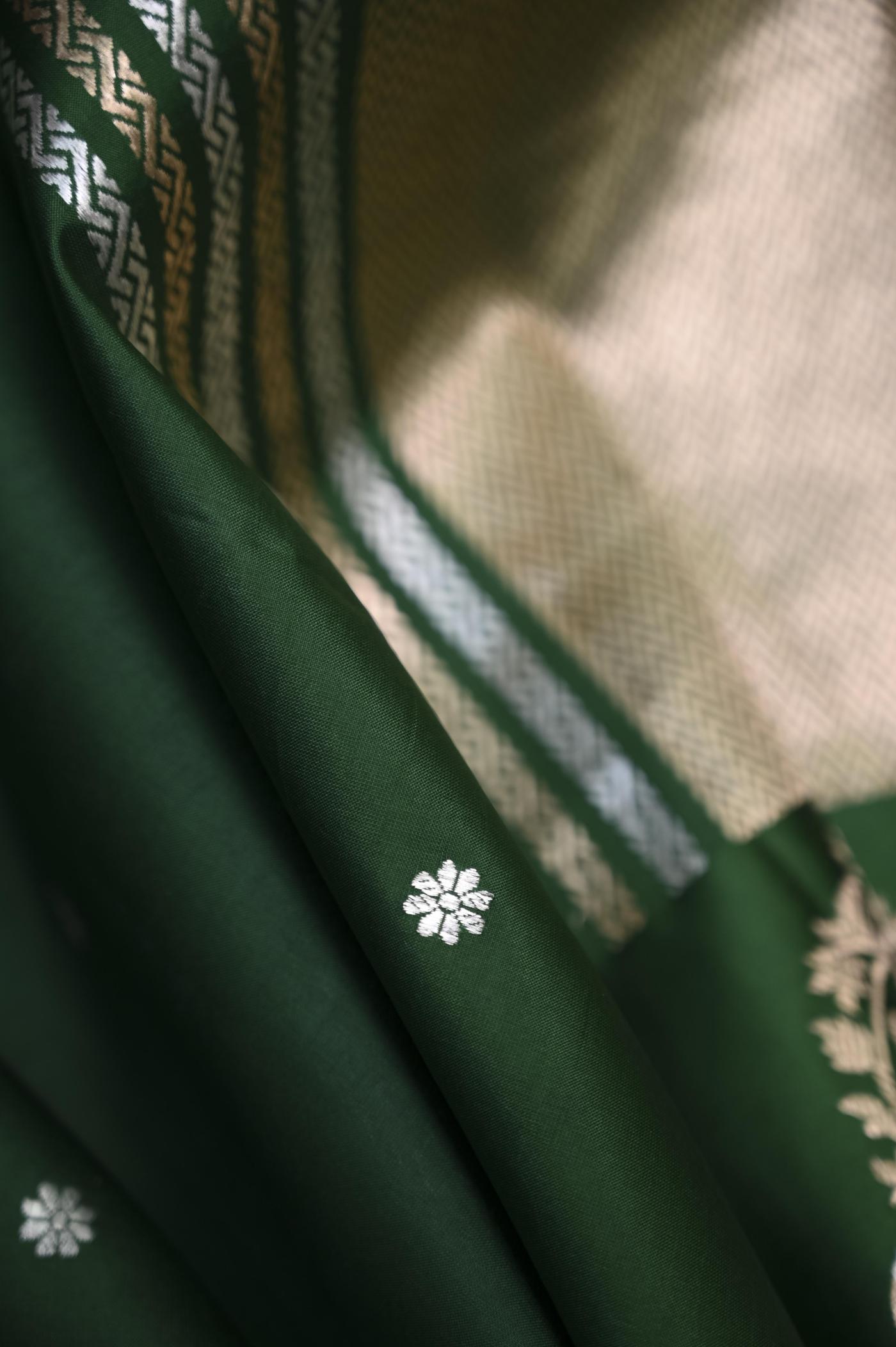 The rich green shade adds a fresh yet elegant appeal, making it suitable for festive occasions, cultural events, and traditional celebrations. Crafted on traditional looms, the fabric offers a soft texture, rich feel, and a graceful drape that enhances its handcrafted beauty.