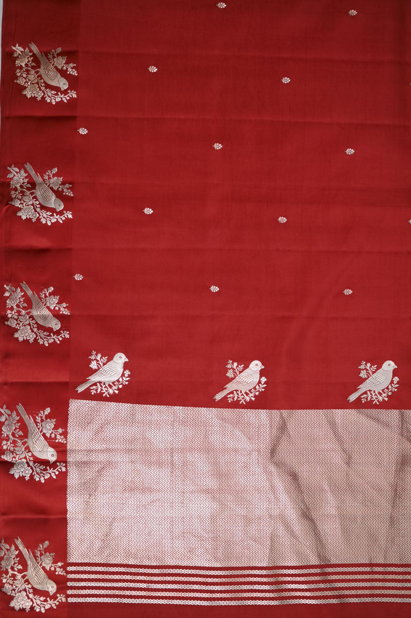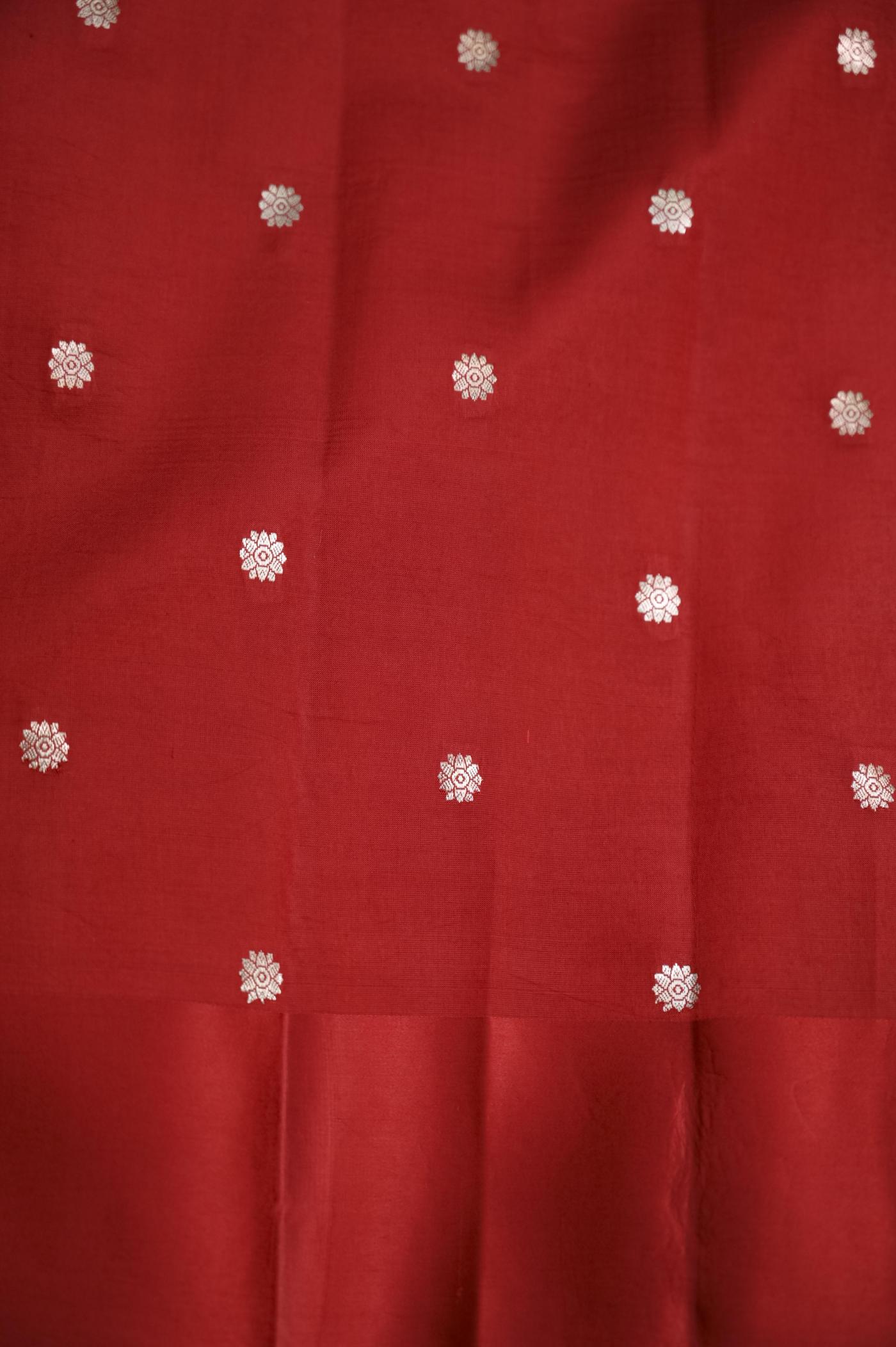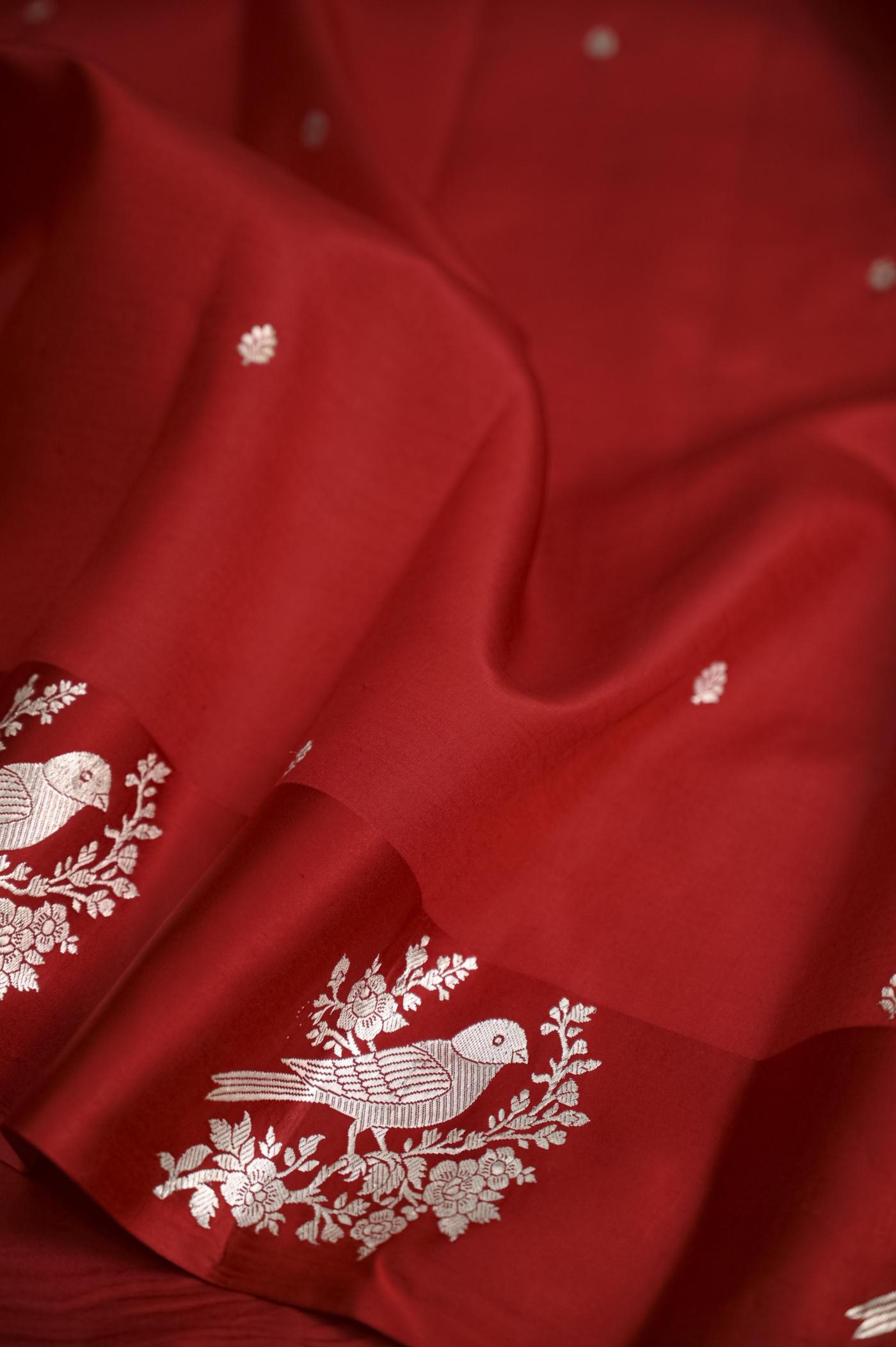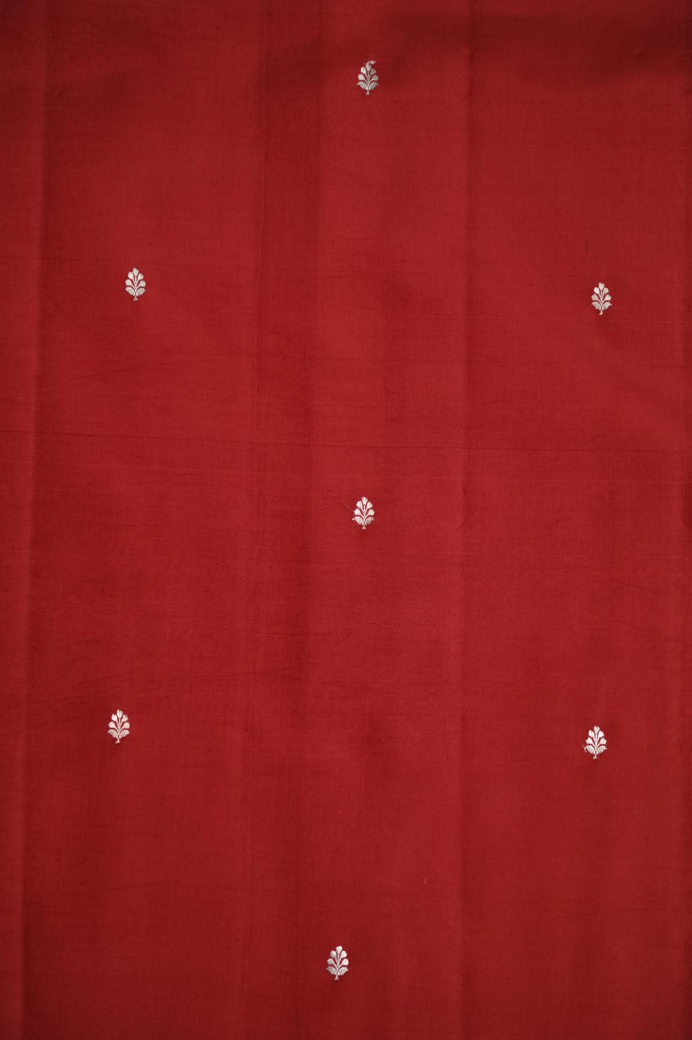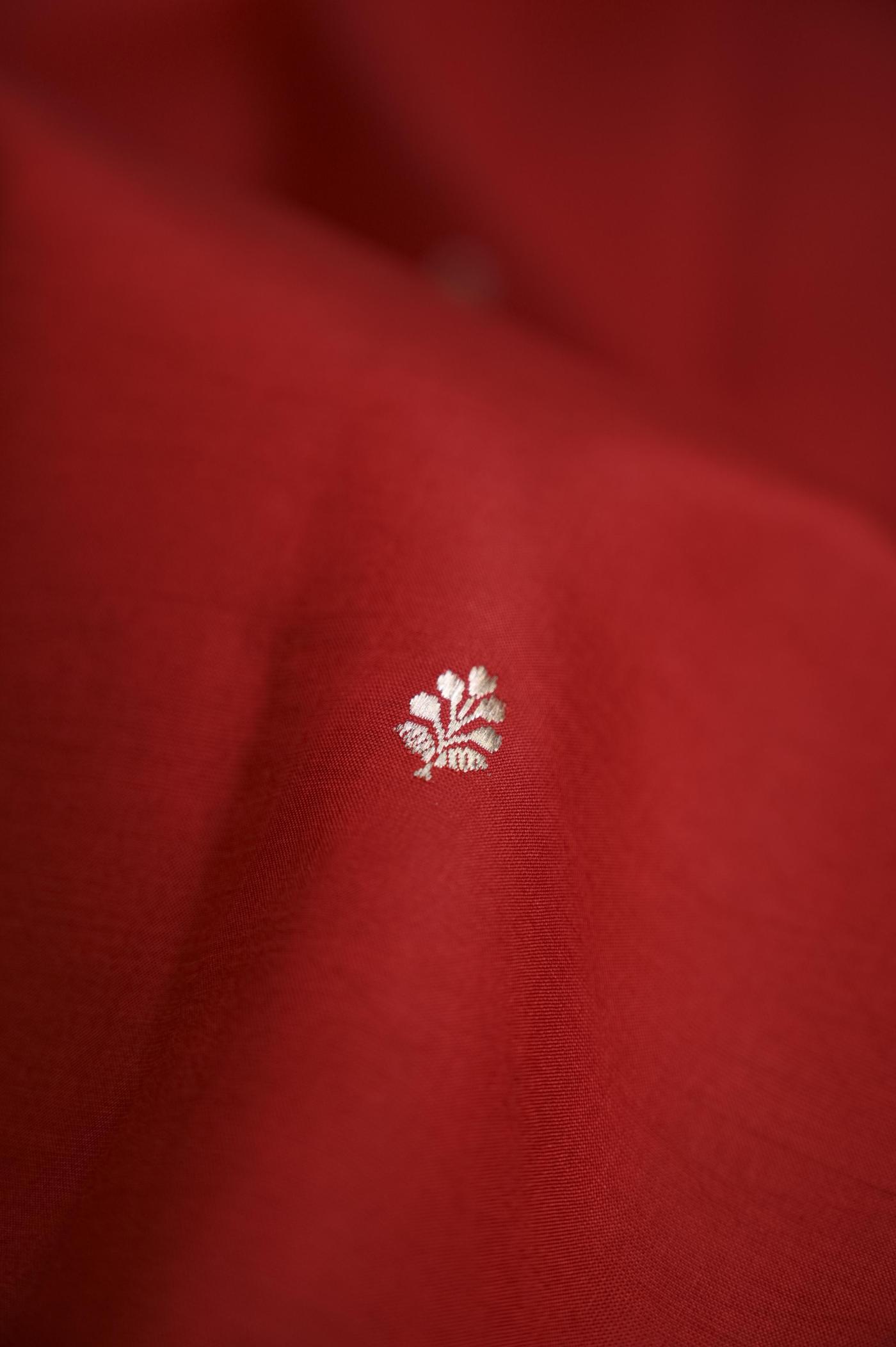 The rich red hue adds a festive and graceful charm, making it perfect for weddings, celebrations, and traditional occasions. Woven on traditional looms, the fabric offers a soft yet rich texture with a beautiful drape that reflects true handcrafted excellence.
