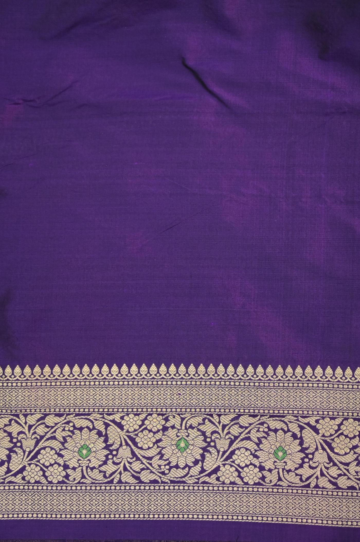 The color palette of this saree is a mesmerizing symphony of hues. Imagine a lustrous base of Purple, adorned with exquisite gold zari work that shimmers like stars. The zari patterns dance across the fabric, intertwining to form a tapestry of intricate motifs, showcasing the skilled artistry of Banarasi weavers.
