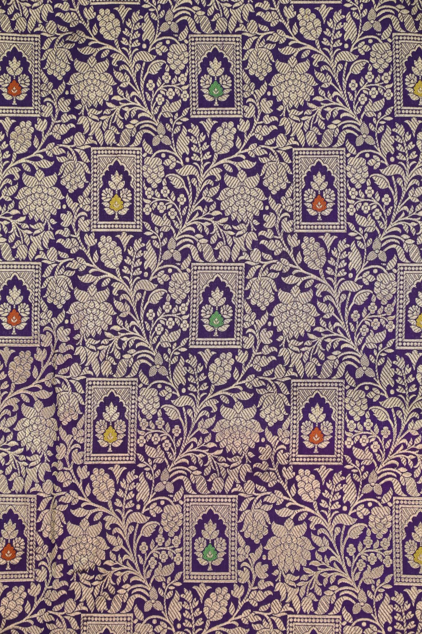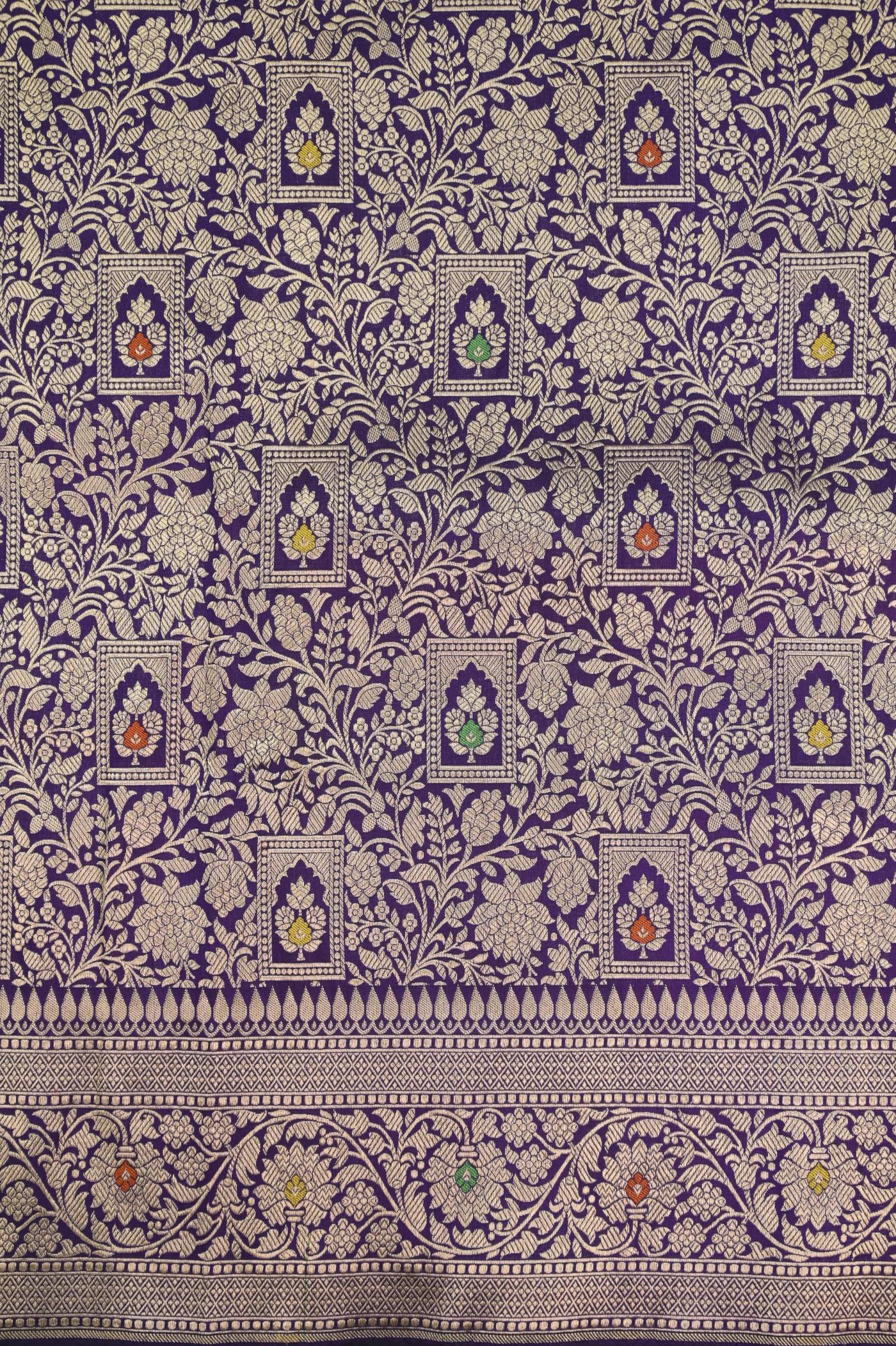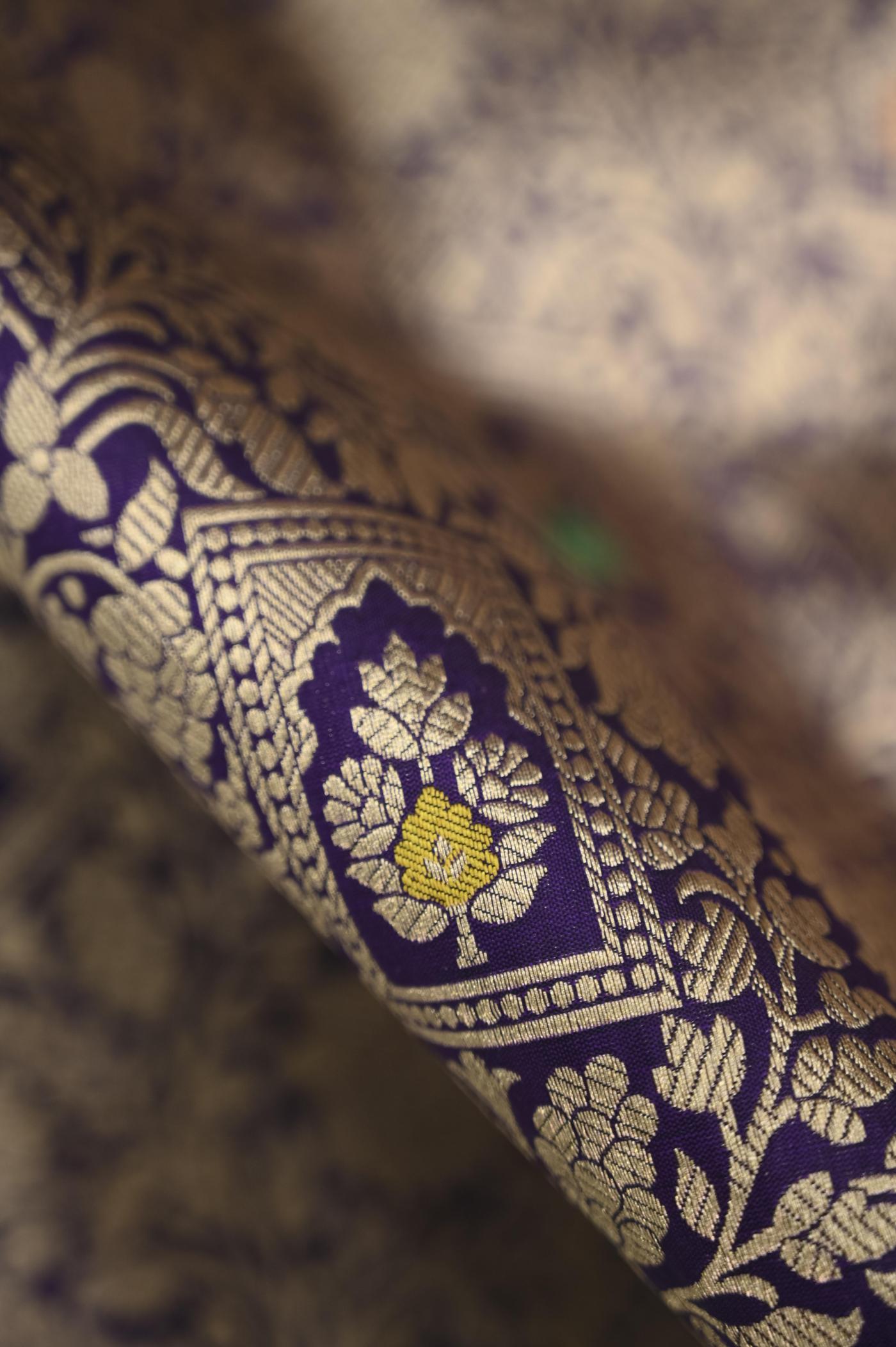 This Purple Katan Alfi Opada Banarasi Saree is a timeless piece of art, embodying centuries of tradition and skill. It is a testament to the weavers' dedication and passion, with every intricate detail reflecting their mastery.