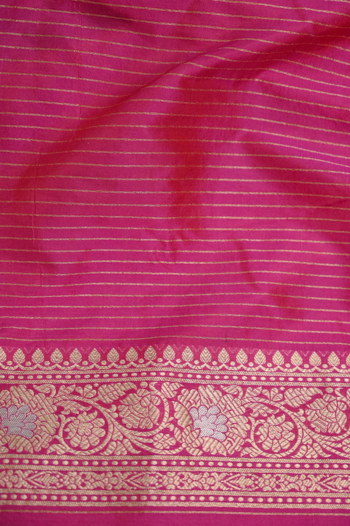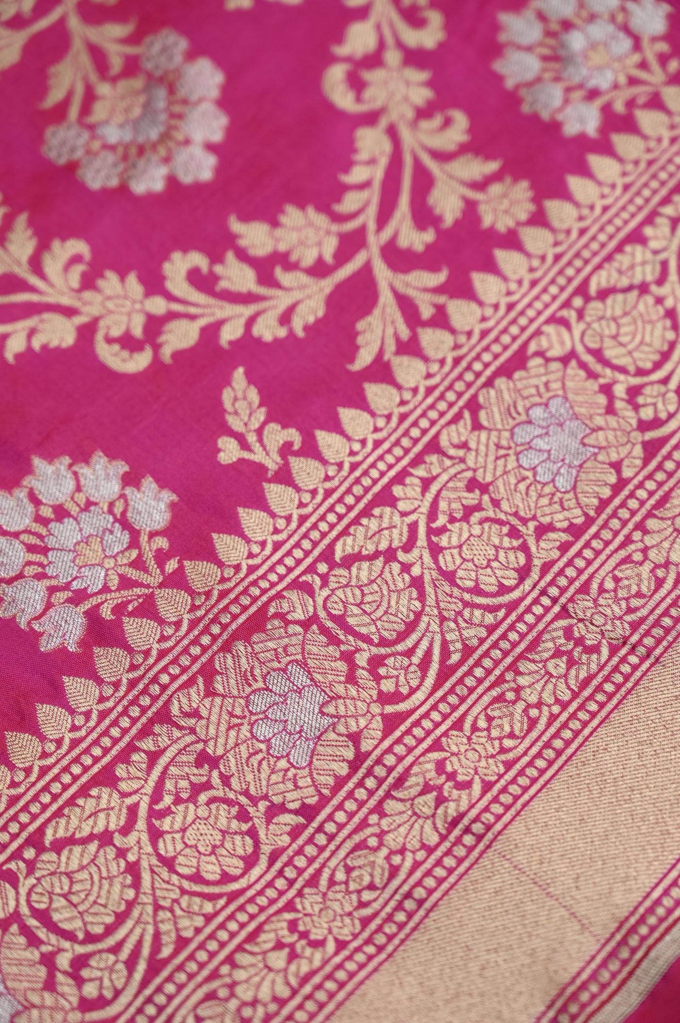 The color palette of this saree is a mesmerizing symphony of hues. Imagine a lustrous base of Rani, adorned with exquisite gold zari work that shimmers like stars. The zari patterns dance across the fabric, intertwining to form a tapestry of intricate motifs, showcasing the skilled artistry of Banarasi weavers.
