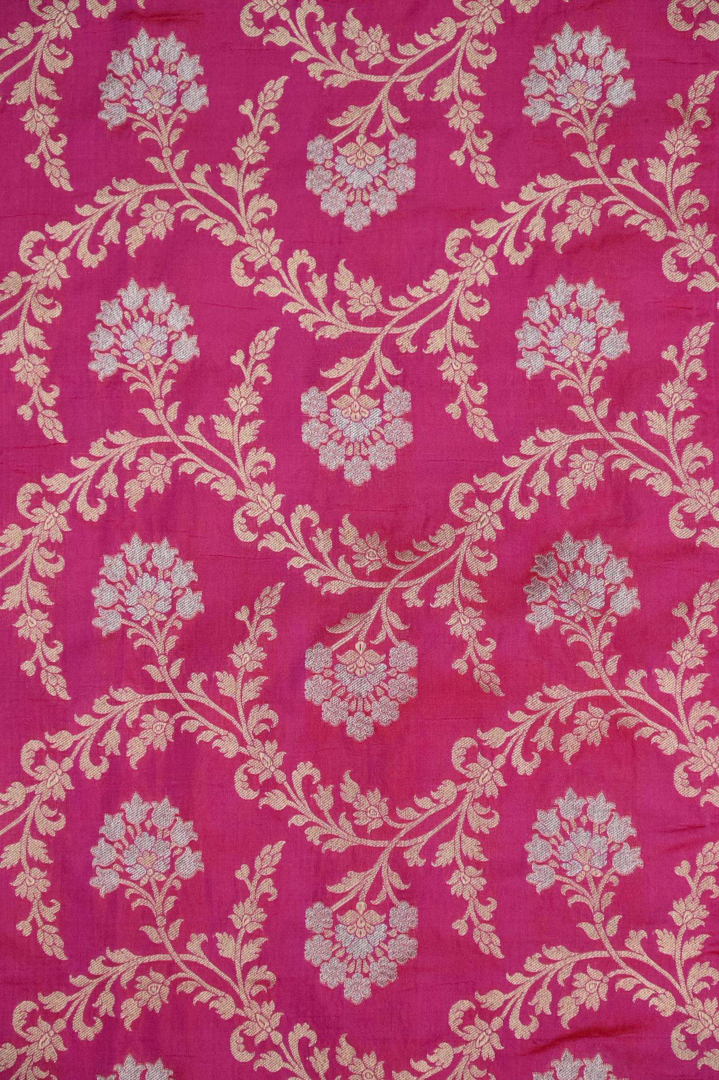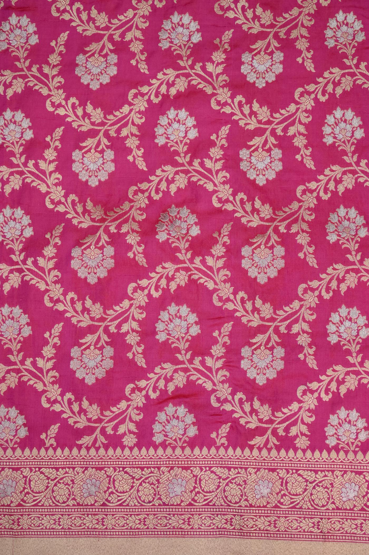 This Rani Katan Alfi Opada Banarasi Saree is woven with the finest Banarasi Katan Silk as Fabric, sourced from the heartland of Banaras, known for its rich textile heritage.
