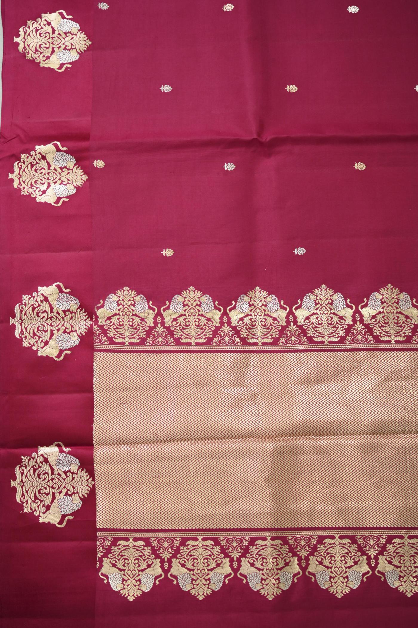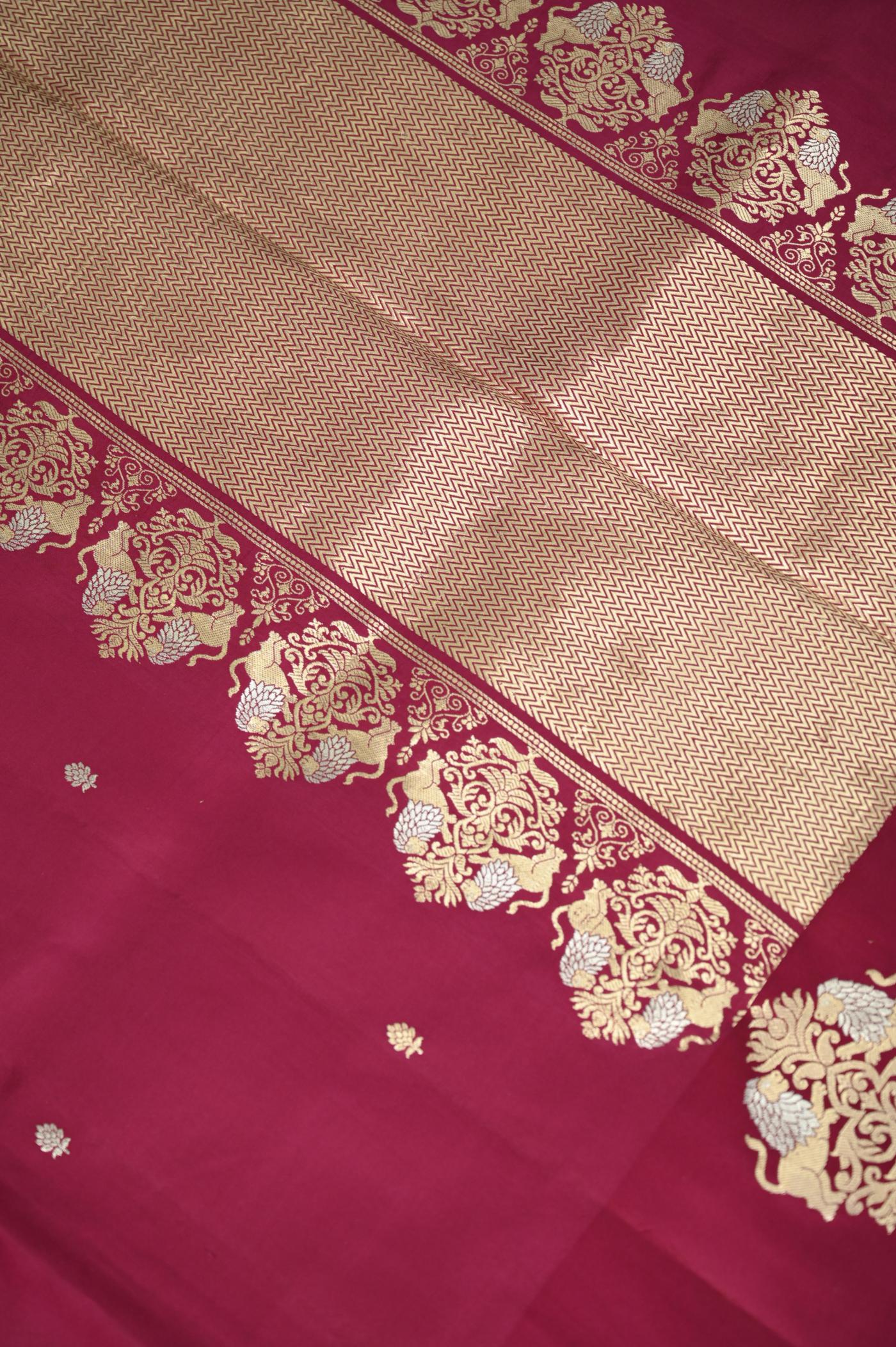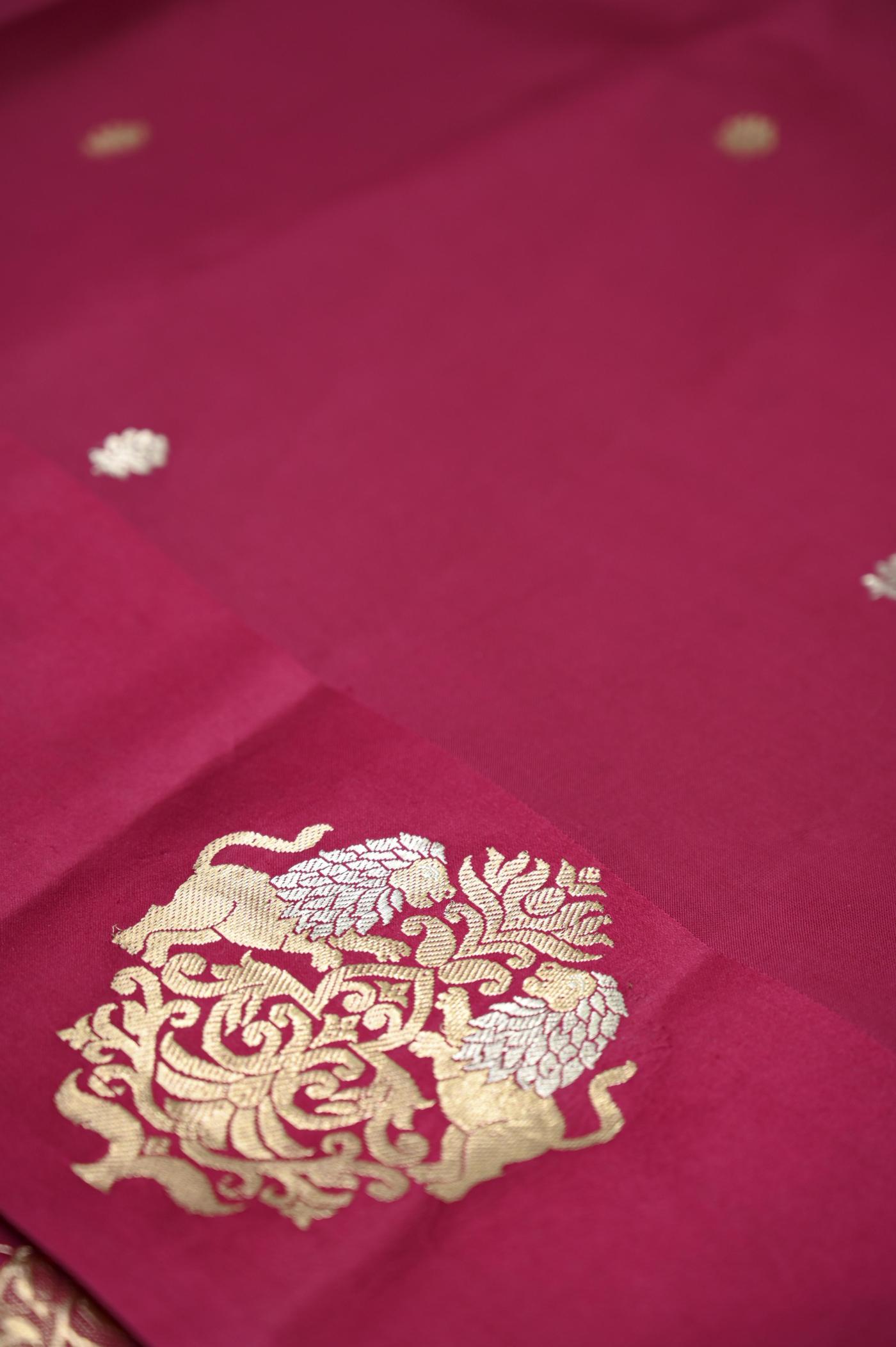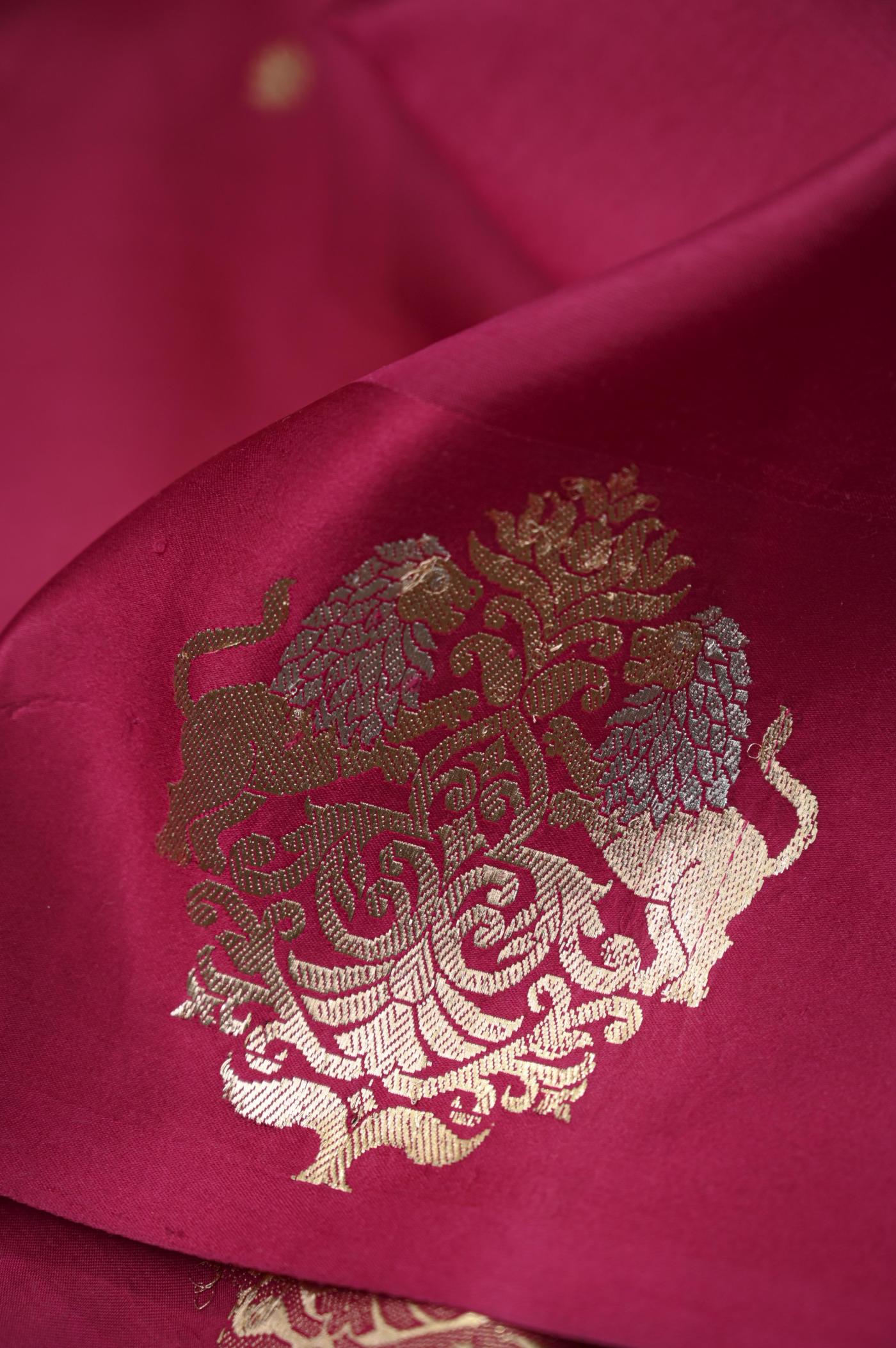 Best to drape and full of shine, this bright rani colour handloom saree with roaring lions is best bnarasi saree to have