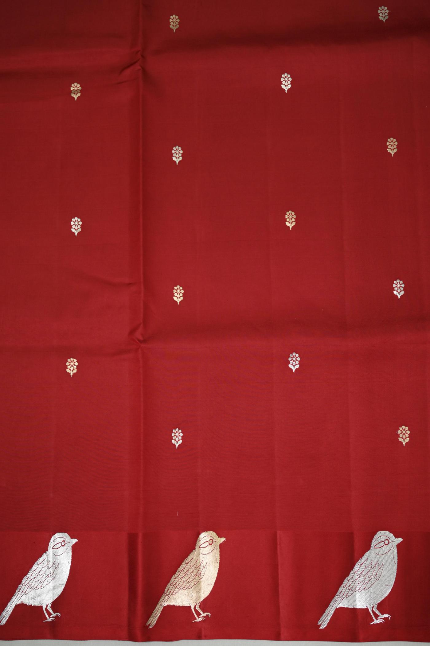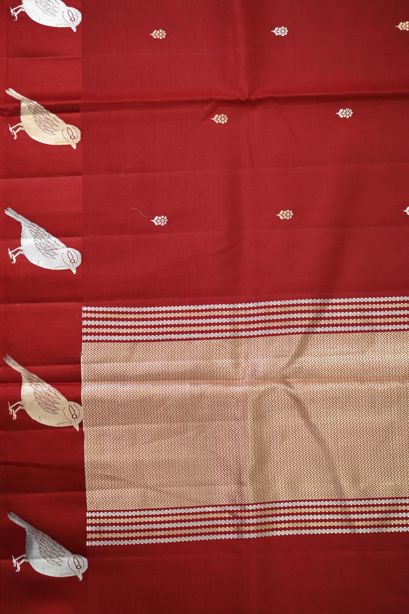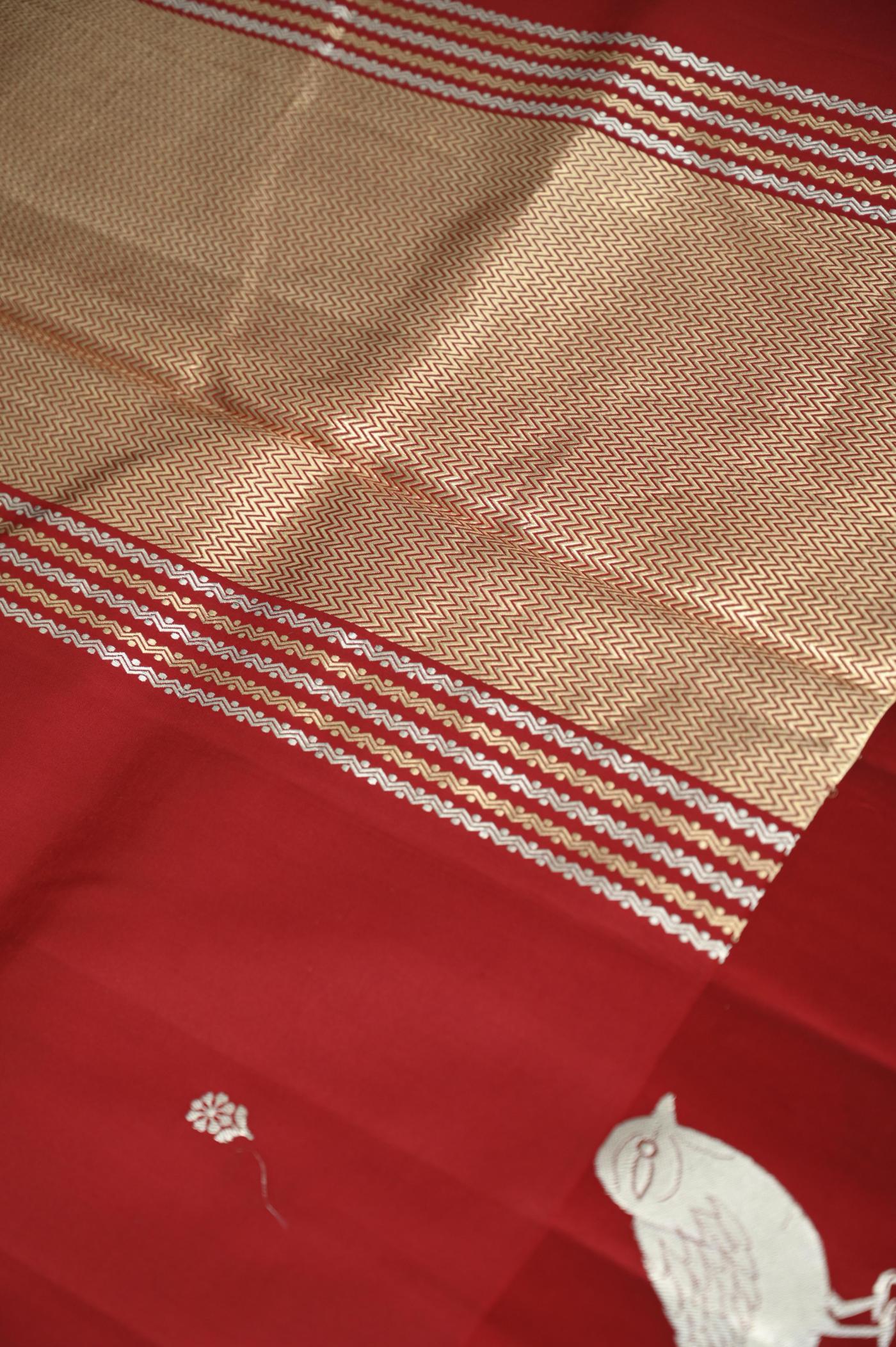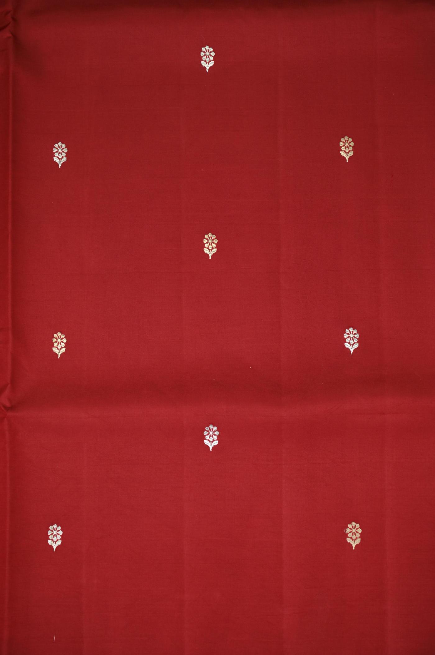The color palette of this saree is a mesmerizing symphony of hues. Imagine a lustrous base of Red, adorned with exquisite gold zari work that shimmers like stars. The zari patterns dance across the fabric, intertwining to form a tapestry of intricate motifs, showcasing the skilled artistry of Banarasi weavers.