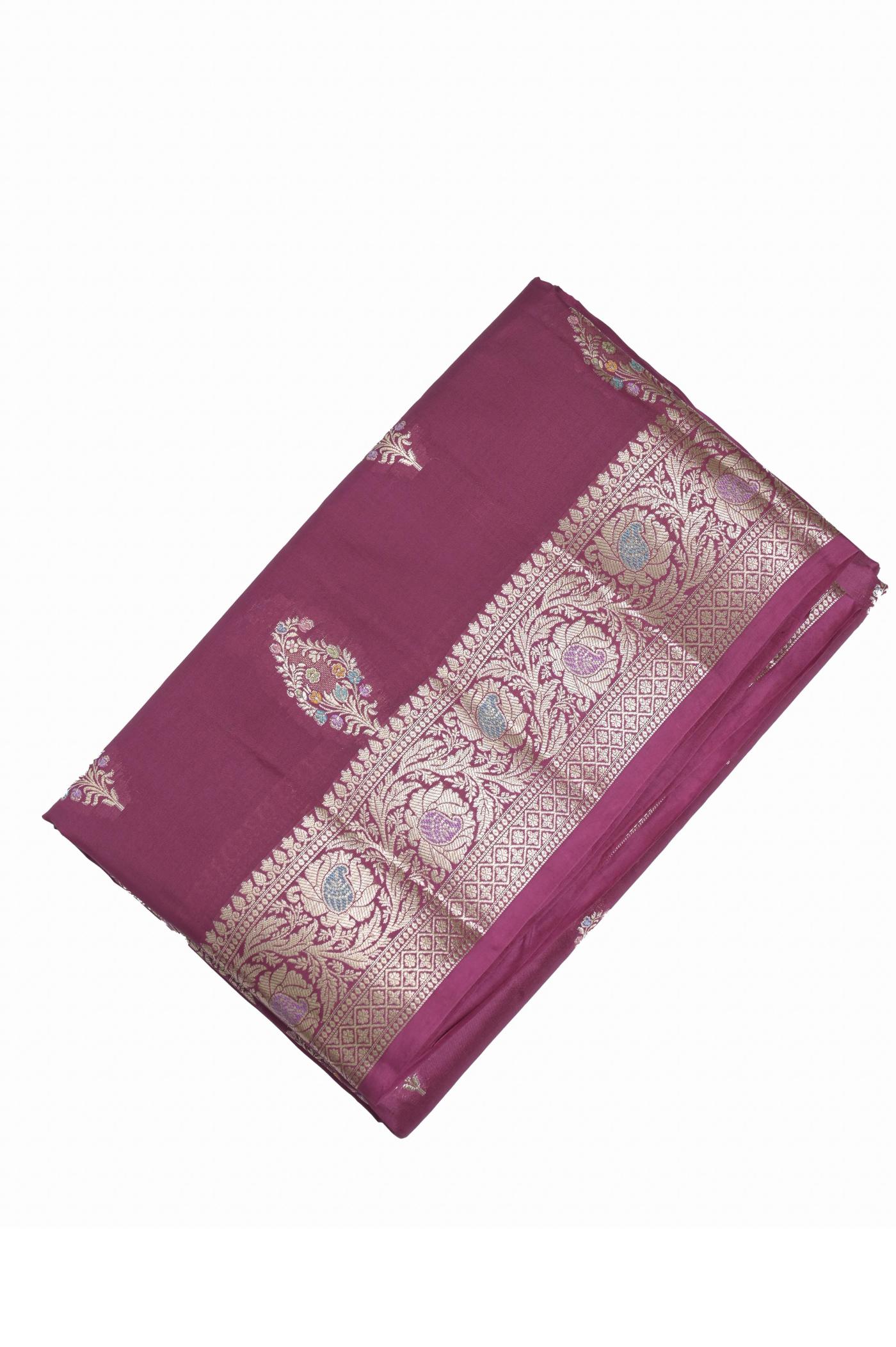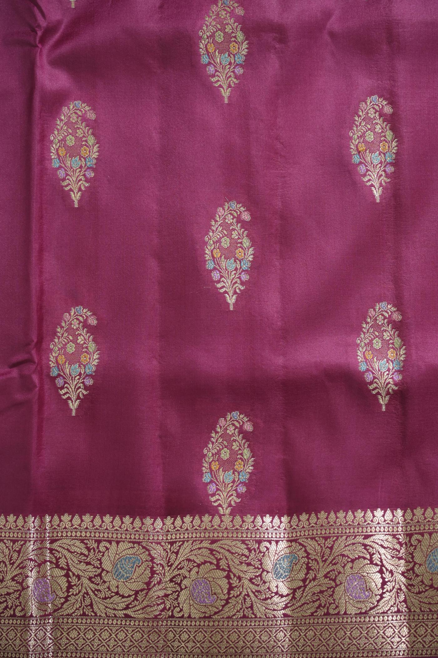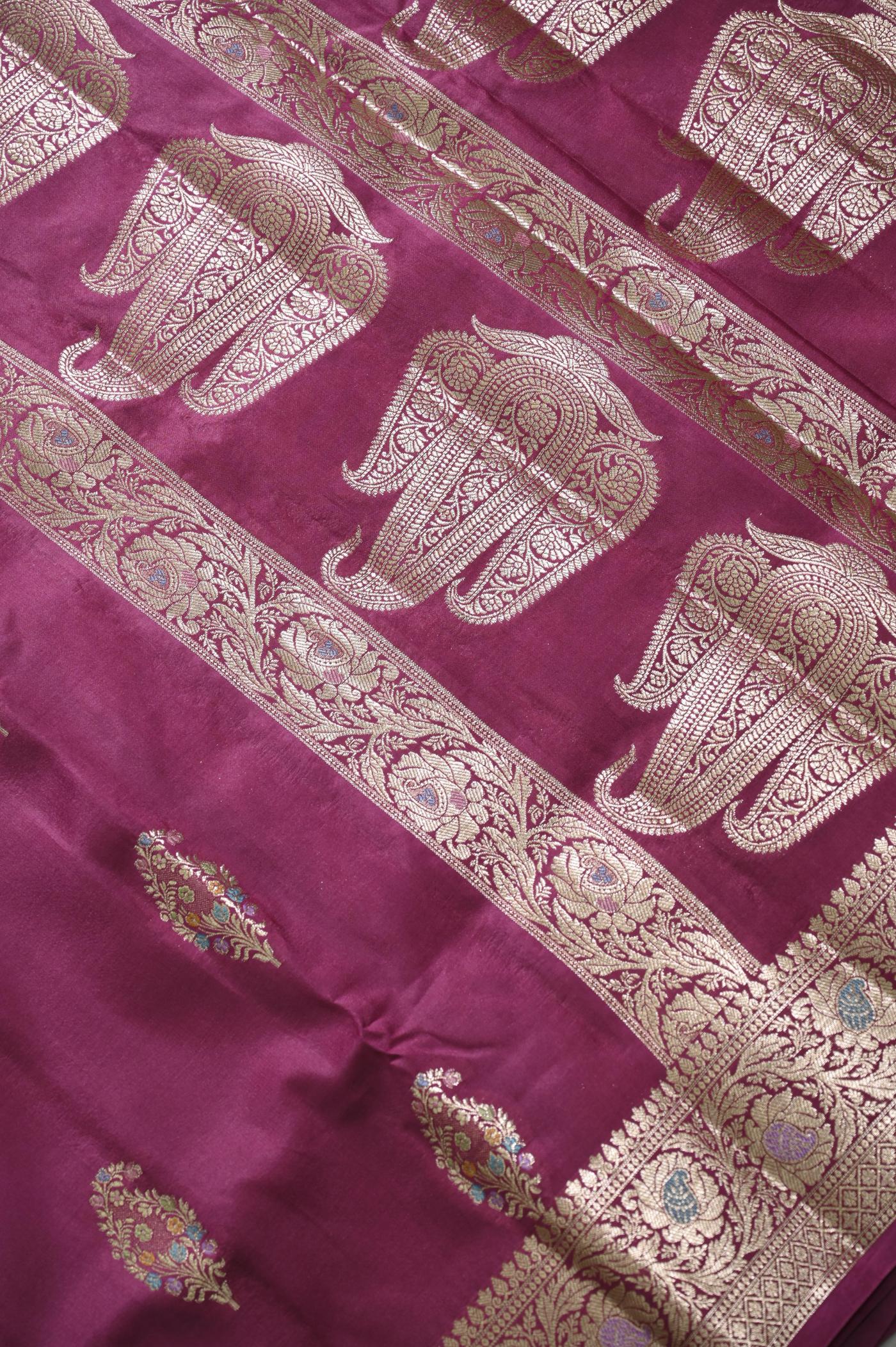 This Wine Katan Silk Banarasi Saree is woven with the finest Banarasi Katan Silk as Fabric, sourced from the heartland of Banaras, known for its rich textile heritage.