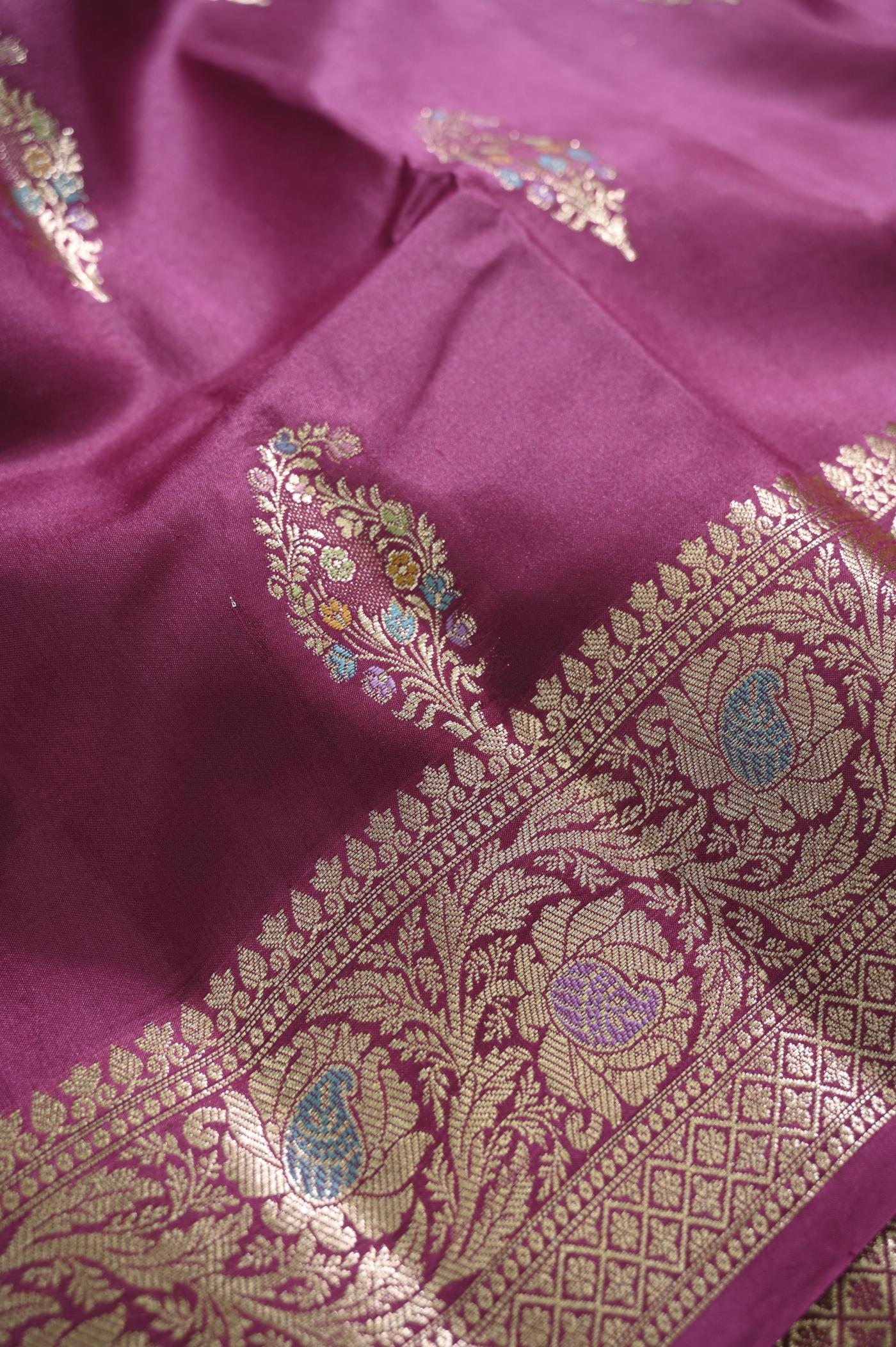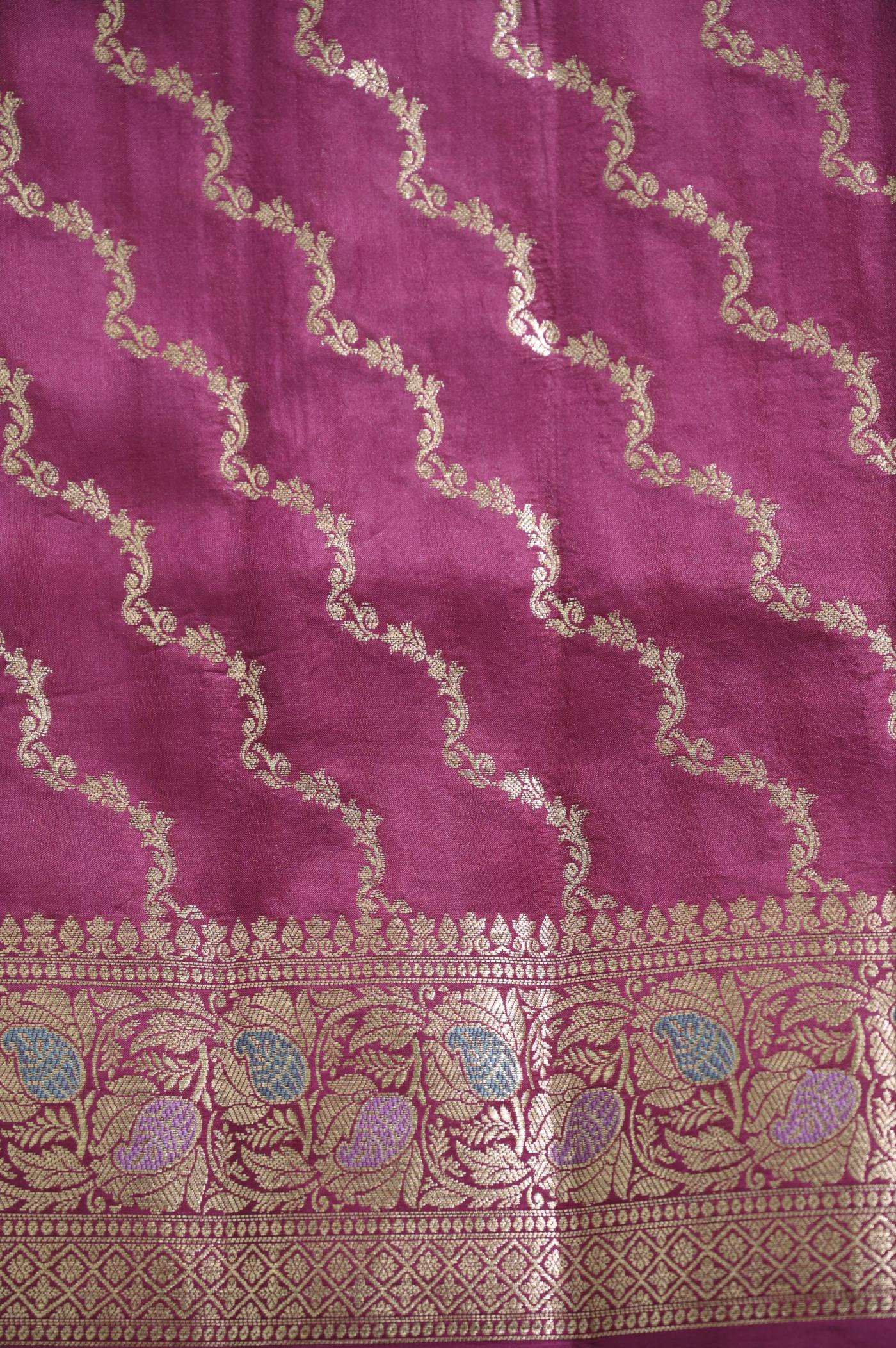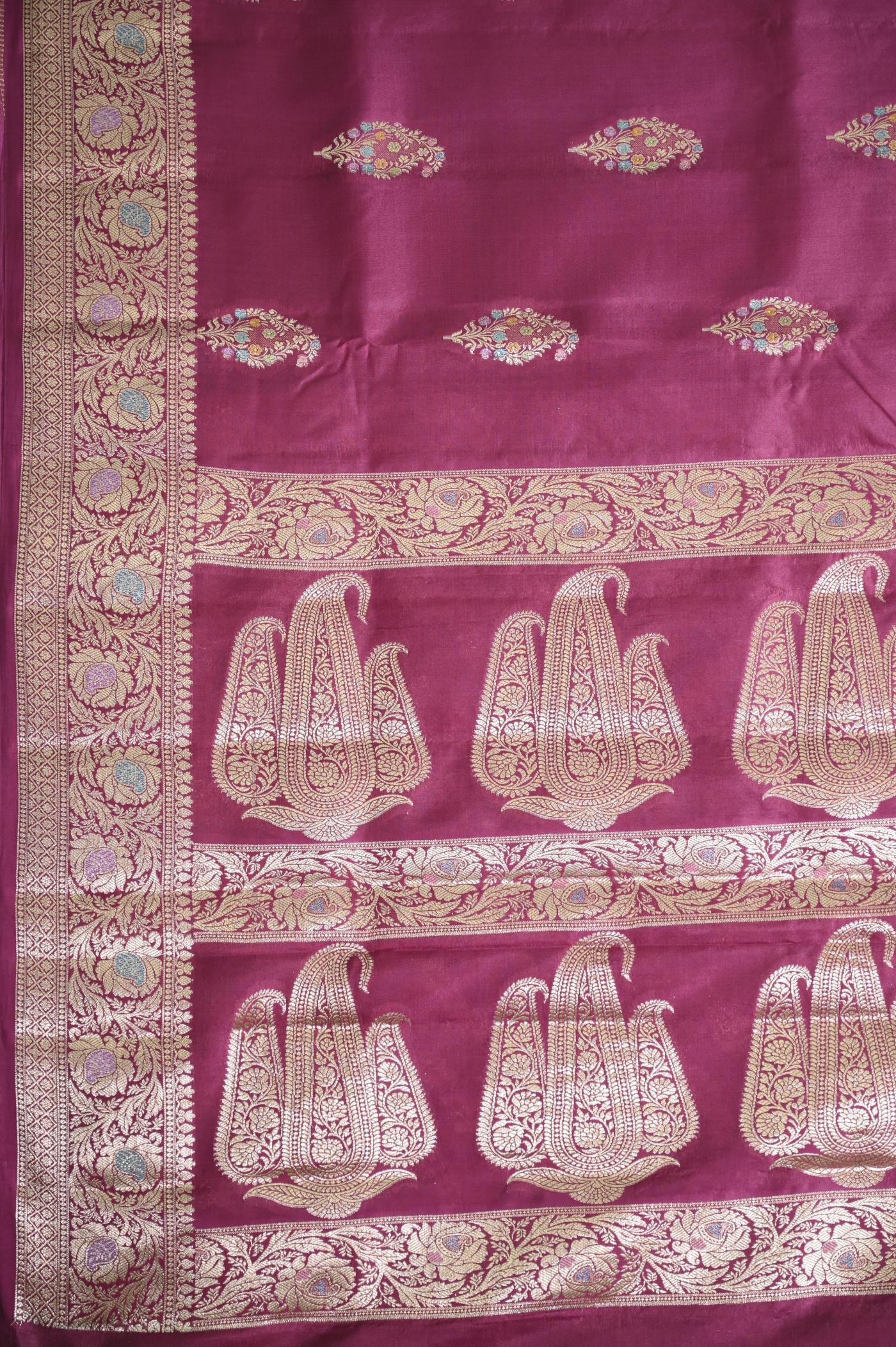 This Wine Katan Silk Banarasi Saree is a timeless piece of art, embodying centuries of tradition and skill. It is a testament to the weavers' dedication and passion, with every intricate detail reflecting their mastery.